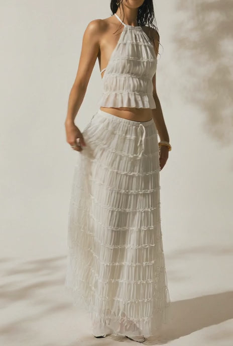 Eleva tu guardarropa de verano con este impresionante conjunto bohemio de dos piezas que presenta un top camisola tipo halter combinado con una falda larga fluida. El diseño transparente y sin espalda con un delicado dobladillo con volantes crea una silueta elegantemente chic, perfecta para ocasiones formales, eventos nocturnos o celebraciones de festivales. Confeccionado en tela tejida 100% poliéster en un versátil tono beige, este conjunto combina la elegancia bohemia con la sofisticación moderna.
